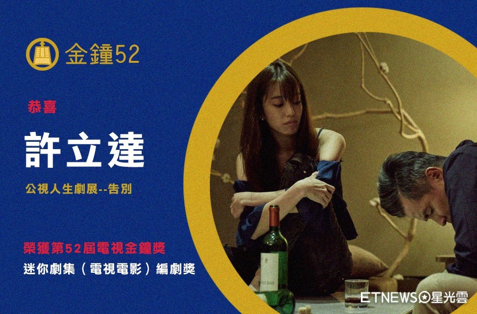 許立達老師的大作《告別》,故事敘述年齡懸殊的男女邂逅,展開一場華麗的冒險,劇本在人物塑造及轉折變化都有驚人設計,由李銘順、陳庭妮、鄭家榆主演,是今年金穗獎的閉幕片,在本屆金鐘入圍了8項,與呼聲極高的《通靈少女》在多組獎項中競爭,頗受注目。許立達老師集編導於一身,他上台領獎時,形容自己寫劇本,彷彿是在黑洞中游泳找不到光線,但在成品完成後,又會想再嘗試劇本創作,「這是一種魅力。」,他喜歡說故事,並將作品比喻為舊情人,他說拍攝時像在談戀愛,付出一切,但覺得很值得,希望往後能說更多的故事。